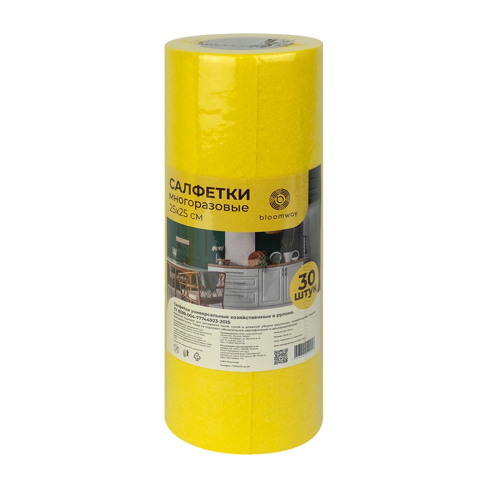 Салфетка в рулоне Bloomway 25*25 (30л), желтый вискоза, №1/12 |