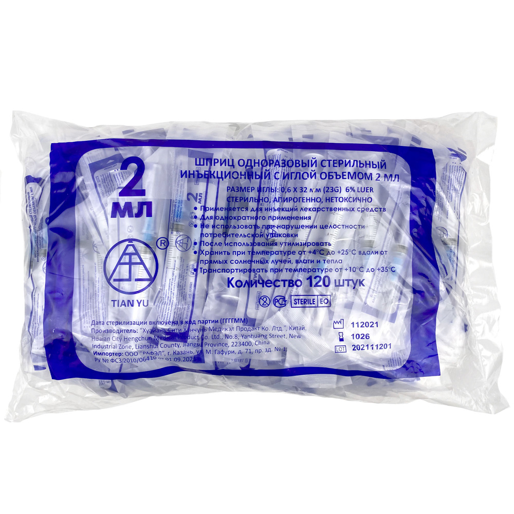 Шприцы одноразовые стерильные инъекционные с иглами, объемом 2 мл (23Gx1 1/4") |