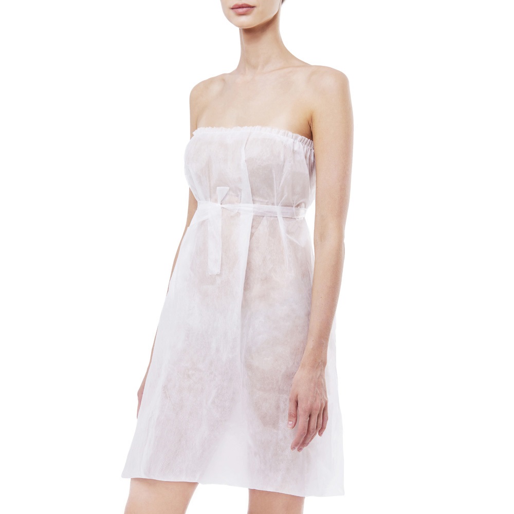 Пеньюары изготовлены из композитного материала СМС – мягкой и прочной ткани, которая не оставляет ворсинок на одежде. Фиксируются с помощью завязок. Пеньюары универсальны, их можно использовать не только во время СПА-процедур, но и в косметологии.