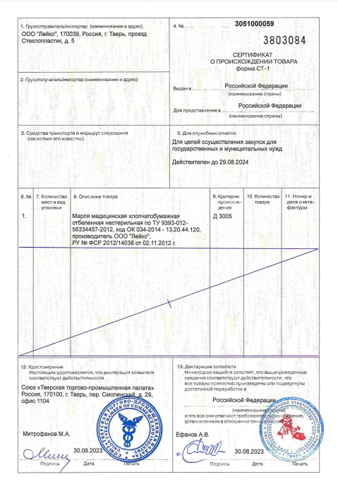 Марля медицинская нестерильная х/б отбеленная 36 гр/м.кв. №1/1000 (ЛЕЙКО) |